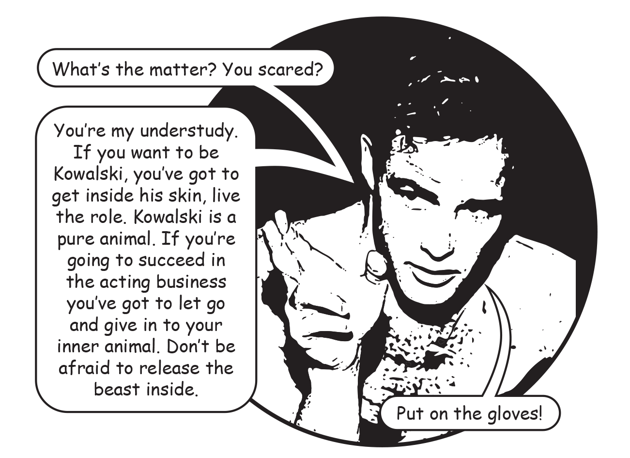 “You scared?” Marlon teased. “You’re my understudy. If you want to be Kowalski, you’ve got to get inside his skin, live the role. Kowalski is a pure animal. If you’re going to succeed in the acting business you’ve got to let go and give in to your inner animal. Don’t be afraid to release the beast inside. Please put on the gloves.”